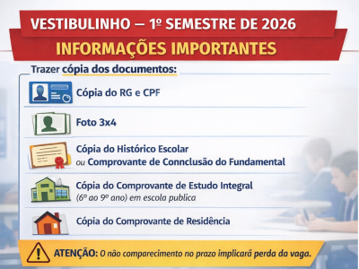 Prezados, Destacamos que, de acordo com o Calendário Escolar, o prazo para solicitação de reconsideração e/ou reclassificação encerra-se em 29/12/2025. A Secretaria Acadêmica realizará atendimento nos dias 19, 22, 23, 29 e 30 de dezembro […]